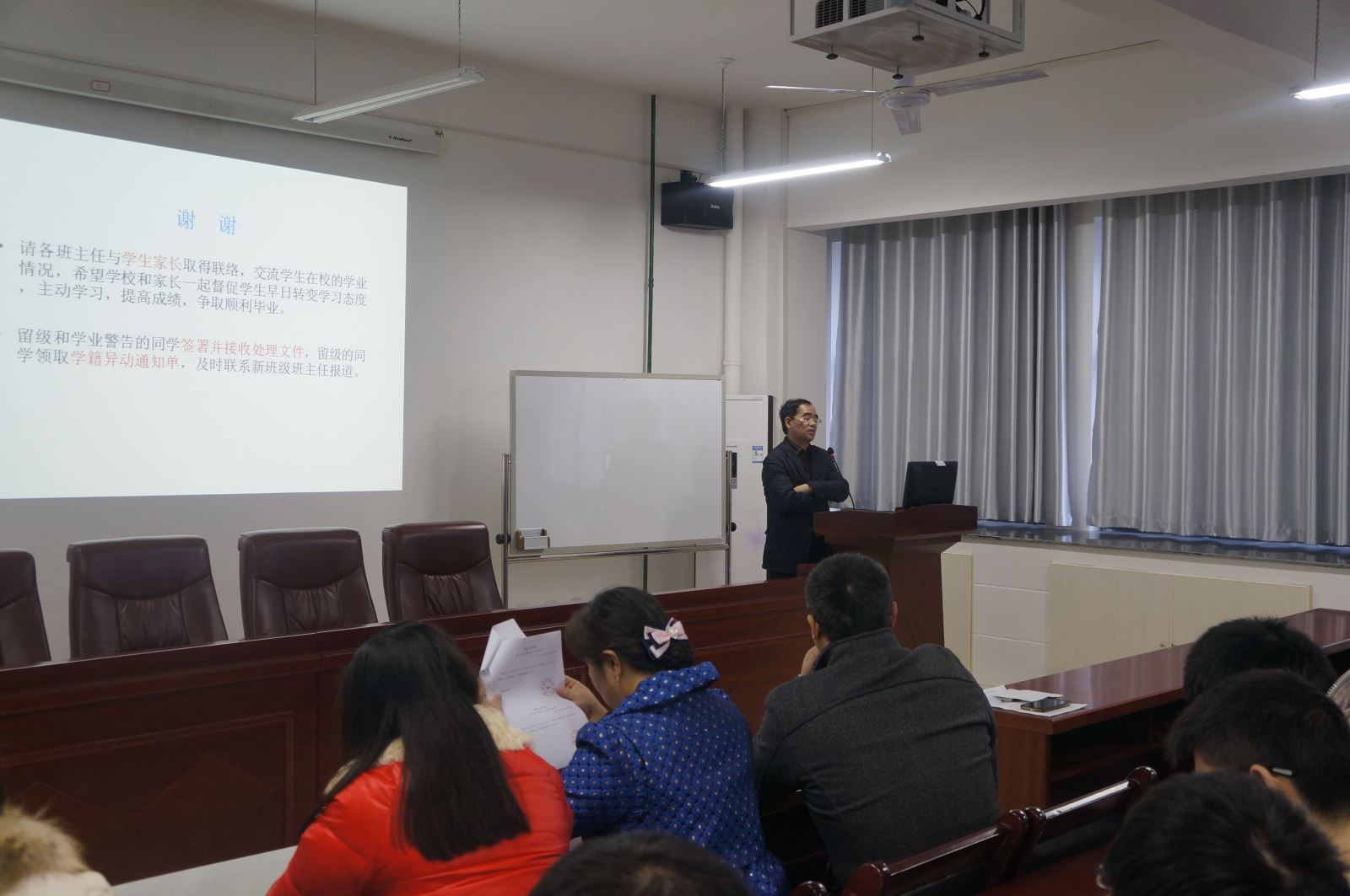 首先,李儒峰宣读了学院12名留级同学名单,并结合学院留级的相关规定对可能会留级的同学做出了提醒,同时要求相关班主任认真做好工作交接。随后,李星邀请两位曾经留级的同学上台讲话,他们讲述了曾经沉迷于网络的自己,在老师的引导下顺利完成学业的经历。接着,卿上乐结合实际情况将大学生学习落后的原因归纳为:不适应大学生活、无目标、自制力差。他也向同学们提出了解决方案,他指出学习没有捷径,树立目标、合理利用时间、脚踏实地、坚持不懈才是学习之道。最后他强调此次会议的目的不是给同学们一个处分,而是提醒同学们要抓紧时间学习顺利完成学业。