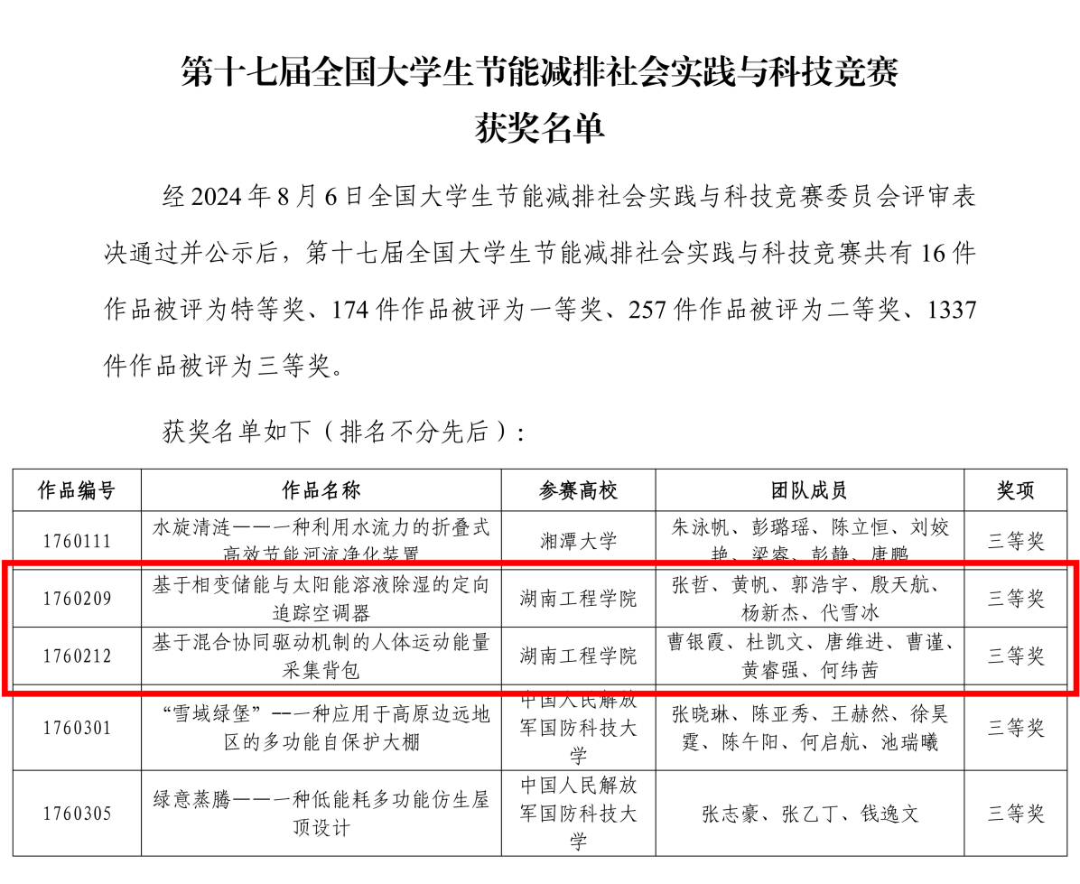据悉,全国大学生节能减排社会实践与科技竞赛是教育部认可的A类学科竞赛,是全国十大大学生学科竞赛之一,也是全国高校影响力最大的大学生科创竞赛之一。此次大赛成绩的取得,充分展现了学生的创新潜能与团队协作精神。本次大赛,学院和智创实验室给予了大力支持,邹鸿翔、王金行等老师进行了悉心指导。