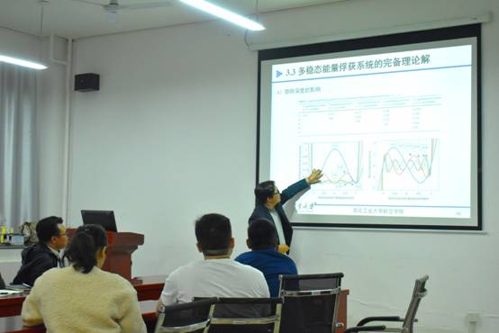 周生喜指出,能量俘获就是把环境中未被充分利用的能量进行充分利用,他以水的机械能和风的机械能转换为另一种机械能为例,加深老师和学生对能量俘获概念的理解。他根据团队研究成果,以研究数据为基础,从研究背景出发,围绕旋转式磁耦合的非线性能量俘获结构、宽频带多稳态能量俘获机理、非线性能量俘获增强机理,以及面向实用化的能量俘获设计、建模和测试这四个方面详细阐述了振动能量俘获的理论与应用。他结合具体实例,介绍了振动能量俘获在工程、航空、人体等方面的应用,并指出振动能量俘获的应用前景和优势。报告会气氛活跃,周生喜与师生进行了亲切的交流,师生们均表示受益匪浅。