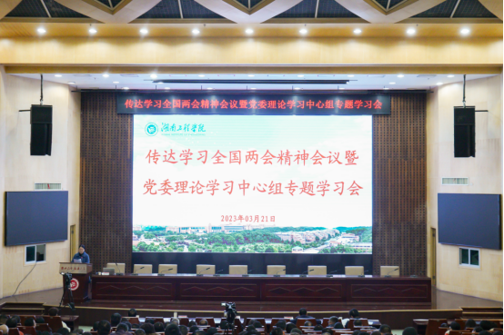 3月21日,我校在一报告厅召开传达学习全国两会精神会议暨党委理论学习中心组专题学习会。全国政协委员、副校长陈赤平作全国两会精神专题报告,第一时间将全国两会精神带回校园,传达高质量发展好声音,激励广大师生团结奋斗,以实际行动推动全国两会精神在湖工迅速落地生根。校党委副书记、校长易兵,党委委员、校领导,党委理论学习中心组成员,全体中层干部,市、区人大代表、政协委员,统战团体主要负责人,马克思主义学院全体教师,全体辅导员,学生代表参加集中学习,各基层党委(党总支部)组织师生代表通过线上方式在各分会场收看会议直播。报告会由党委委员、副校长向前主持。