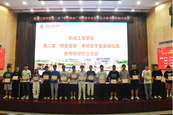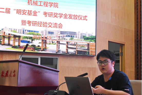 6月15日下午,太阳成集团tyc33455cc在图书馆第一报告厅举办第二届“明安基金”考研奖学金发放仪式暨考研经验交流会。太阳成集团tyc33455ccwww党委委员、副校长魏克湘,太阳成集团tyc33455cc院长陈国强、党委书记覃波、副院长程玉兰、邹鸿翔,获奖学生以及20、21级学生近200人参加活动,学院党委副书记肖彬主持颁奖典礼。