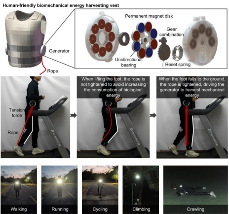 以“Human-friendly biomechanical energy harvesting vest for self-powered disability assistance functions”为题发表于国际能源领域权威期刊《Energy》上,提出了一种人类友好型生物力学能量收集背心(HBEHV),用于自供电的残疾人援助功能。线驱动机构既能有效传递人体运动产生的驱动力,又能避免刚性机械部件对人体关节的约束和磨损。将低频不规则的人体运动激励通过机械调制转化为高速旋转的机械能,再通过电磁感应原理将机械能转化为电能。通过一系列的佩戴试验,验证了HBEHV对人体的影响可以忽略不计。佩戴HBEHV的志愿者在以10公里/小时的速度运行时,平均总功率为3.95 W。一名女性志愿者以4公里/小时的速度行走,可以在50秒内将1 F的电容器充电到5 V。HBEHV可以适应不同体型和体重的人,以及可以正常行走的残疾人。基于HBEHV,开发了视障人士自供电避障可穿戴设备和语言障碍人士自供电手语识别可穿戴设备。HBEHV为具有运动能力的残疾人可穿戴辅助设备的可持续供电提供了新的思路。邹鸿翔教授为第一作者,指导的硕士研究生秦楠为第二作者,白泉副教授和上海交通大学赵林川博士为通讯作者。