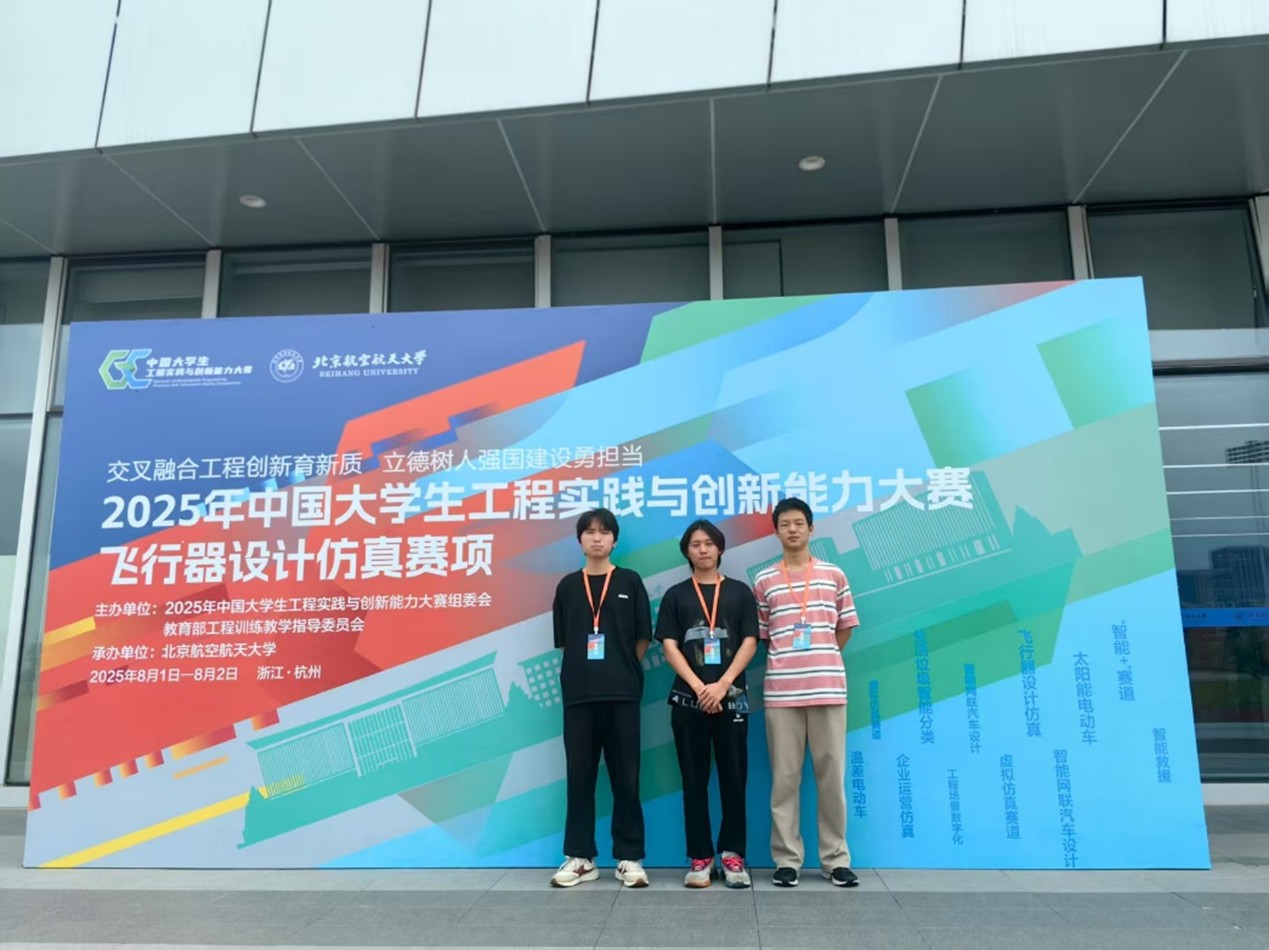 本届大赛总决赛汇聚了来自全国26个省级行政区的94支顶尖队伍。在“飞行器仿真设计赛项”中,依托组委会指定的虚拟仿真平台,团队需在模拟的真实战场与灾害救援场景中,综合比拼飞行器操控、复杂策略规划及多任务协同能力。我校代表队(成员:欧阳卓、郑颖、沈文雄)凭借扎实的专业功底和默契配合,不仅在核心赛项中夺魁,更在“航空救援”和“协同对抗”两个分项中表现亮眼:以航空救援赛项全国第七、协同对抗赛项全国第四的优异成绩,成功晋级由北京航空航天大学组织的巅峰对决环节。在巅峰对决的终极较量中,团队愈战愈勇,斩获了航空救援全国三等奖,协同对抗全国亚军的优异成绩,创造了我校在该项赛事中的历史最佳成绩。
