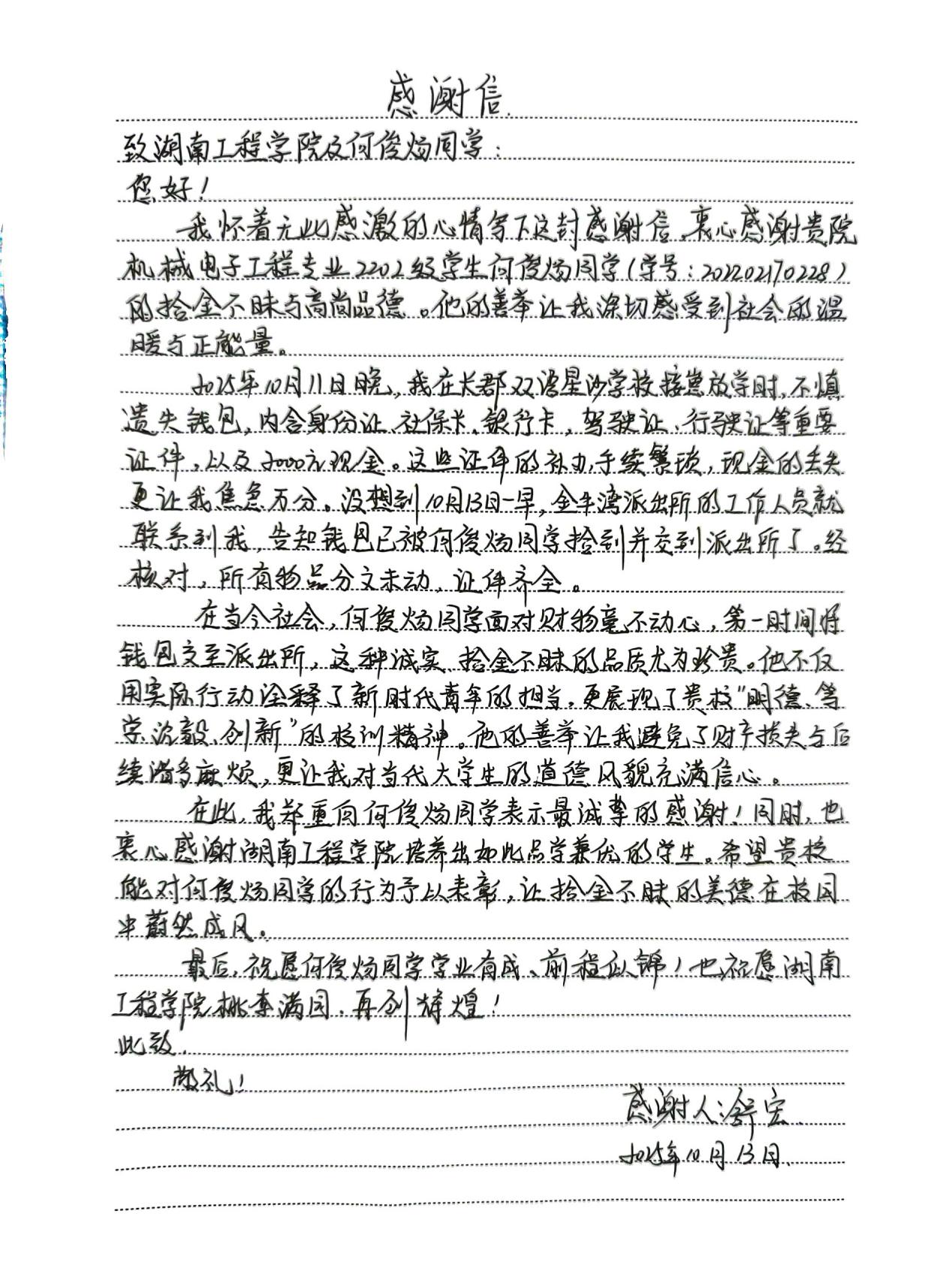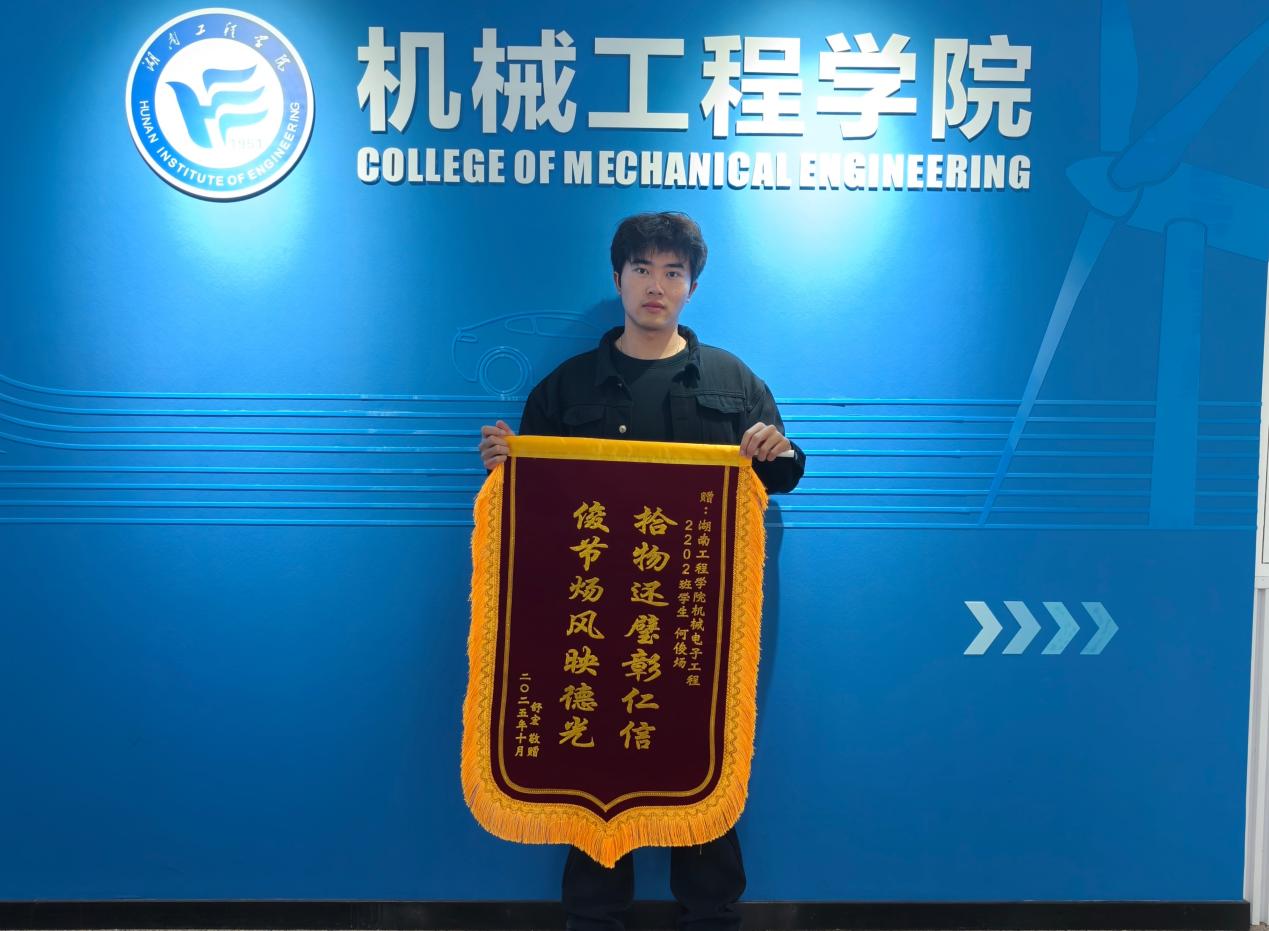 近日,太阳成集团tyc33455cc学生工作办公室收到两面锦旗与一封感谢信,致谢机械电子工程2202班何俊炀同学的拾金不昧之举,也为学校立德树人的扎实成果“点赞”。