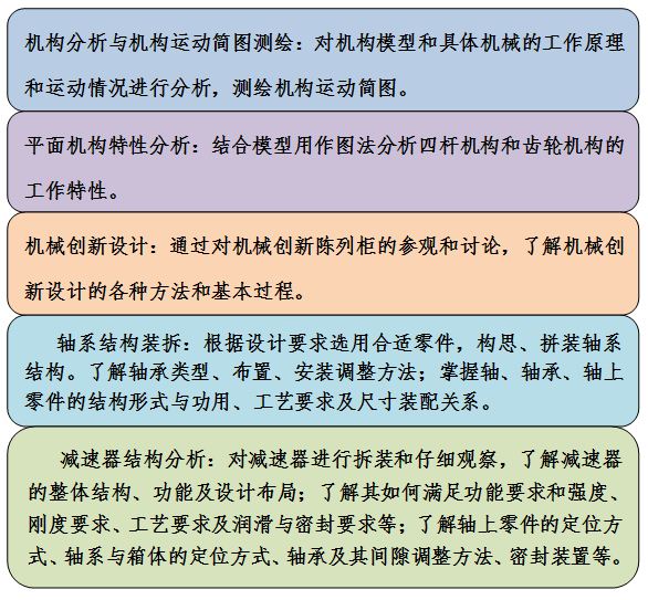 可开设实验:机构分析与机构运动简图测绘、平面机构特性分析、机械创新设计、轴系结构装拆、减速器结构分析、机械构造及机械设计创意