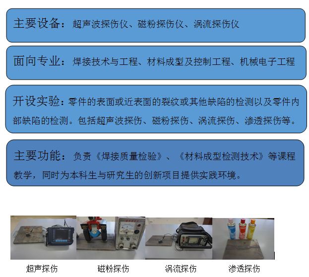 无损检测实验室现有固定资产65万余元,设备10多台套,主要设备有:CEW-2000C交直流两用磁粉探伤仪一套,CDX-4多功能磁粉探伤仪两套,DZ-125W紫外灯四套,CTS-26全数字电脑多功能涡流仪两套,TUD280全数字超声波探伤仪三套。主要开设的实验项目有:磁粉检测,超声检测,涡流检测和渗透检测。