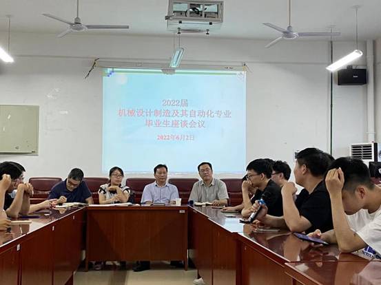 2022年6月2日,机械设计制造及其自动化专业举行2022届毕业生代表座谈会。副校长魏克湘,机械学院院长陈国强,副院长程玉兰,副书记肖彬等出席会议,会议由机械设计制造及自动化教研室主任黄炼博士主持。