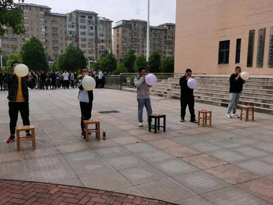 七彩连环炮。以接力的形式第一名同学,跑到指定位置吹气球,直到吹破跑回原位置,换下一个同学,如此轮换以二分钟为限,计时完毕时按吹破气球个数记录成绩,必须在上一个队员吹破,回到起点之后,下一个同学才能开始出发,否则将在总个数里面进行相应扣减。