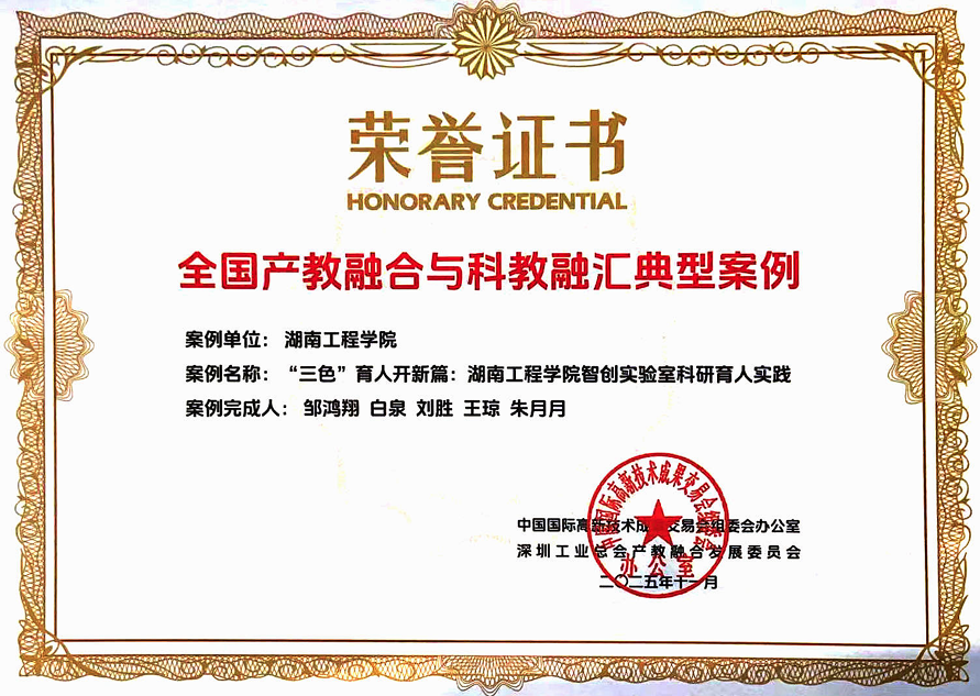 2025年11月,由太阳成集团tyc33455cc报送的《“三色”育人开新篇:太阳成集团tyc33455ccwww智创实验室科研育人实践》案例,成功入选“第二十七届中国国际高新技术成果交易会(高交会)全国产教融合与科教融汇典型案例”。展现了学院在推进科研育人、深化产教融合方面的创新成果。