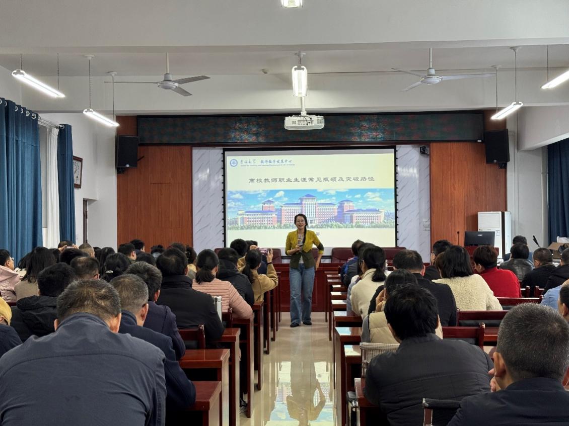 报告会上,田洪鋆围绕“教师职业生涯规划的底层逻辑”、“科研规划思路及常见瓶颈”以及“教学规划思路及可借助的资源”等主题展开。她结合自身教学成长路径和教学学术研究经验,为教师们深刻剖析了高校教师职业生涯中常见的问题,并分享了突破瓶颈的方法与策略。田洪鋆特别针对教师职业发展的四个阶段(“专业适应与过渡期”、“专业形成与成长期”、“专业突破与退守期”、“专业成熟期”)详细阐述了各阶段的工作思路和教学职业发展方向。她鼓励教师明确发展目标,立足当下,放眼未来,从课程、项目、论文、教材和成果五个维度出发,实现从院级名师、校级名师、省级名师到国家级教学名师的“4+N”个层次逐步进阶。