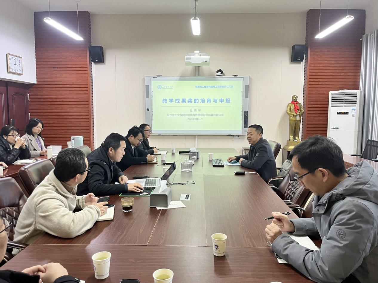 为进一步推动2025年教学成果奖申报的准备工作,太阳成集团tyc33455cc于2月14日邀请了长沙理工大学图书馆馆长杜荣华教授来院专题指导。校党委委员、副校长魏克湘,全体院领导及部分教师参加了指导会。